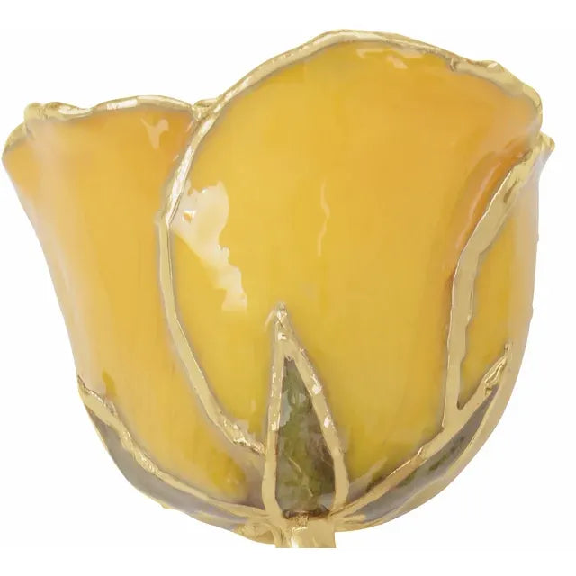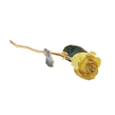 A real, Traditional Color Red Rose with semi-opened petals, Lacquered and Hand-Dipped in 24kt gold plating. Available in Red, White, Yellow and Pink. Stems are approximately 12". Each rose is elegantly wrapped in gold tissue and packaged in a gold, two-piece outer box.